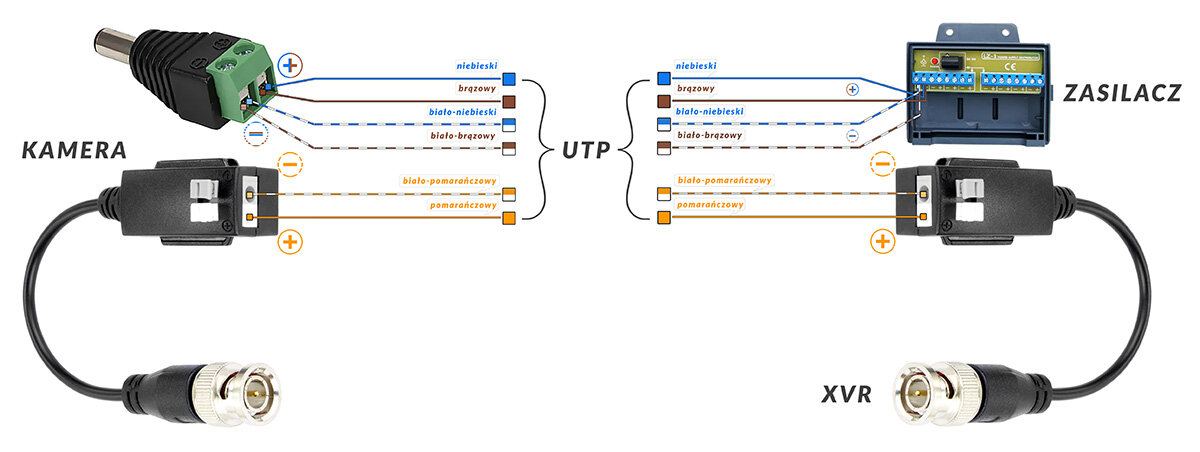 Diagram of twisted-pair connection of AHD CVI TVI camera using UTP-BNC converter and power connector