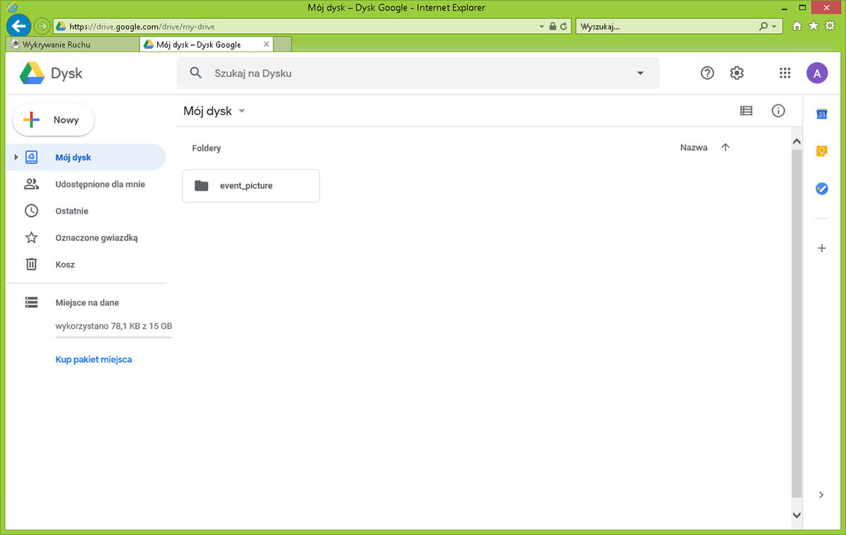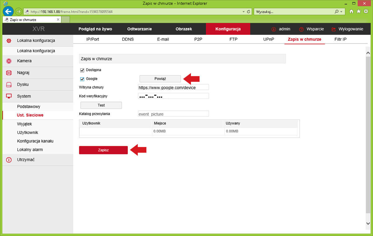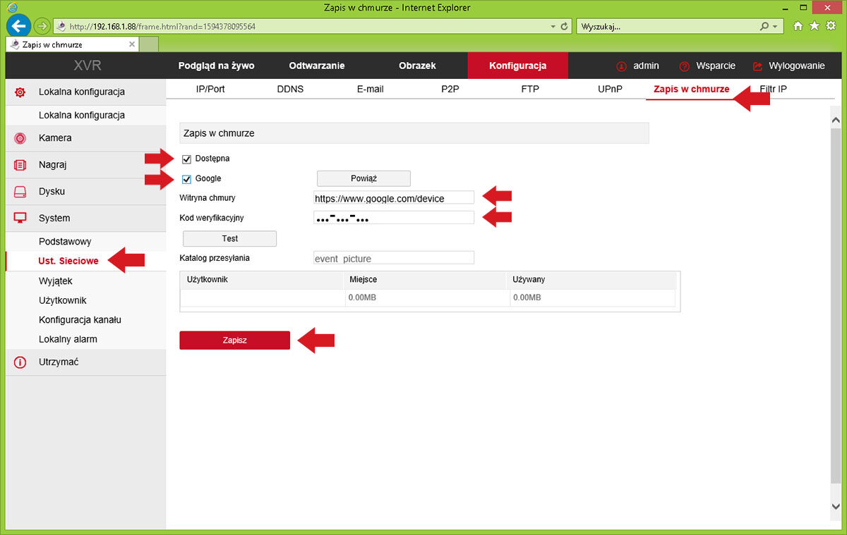 Enable motion detection, this function is necessary to send photos after detection has Google drive. Go to the Configuration / Motion Detection tab. Click on the checkbox next to "available" to enable motion detection (you can enable recording after detection or sending emails). Save changes