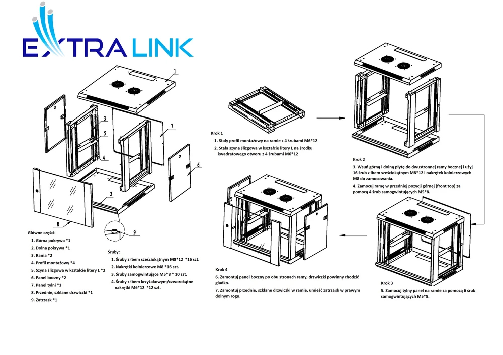 The rack cabinet by Extralink is designed for wall mounting in offices, network server rooms and CCTV control rooms. The outer walls are made of cold-rolled steel sheet. Equipped with a pane of tempered glass, the front door can open to the left or right side.