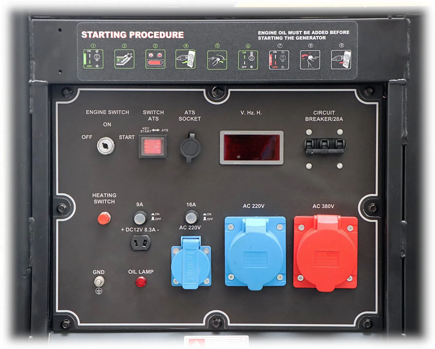 Trójfazowy generator SENCI / Dynamo oferuje do 20 kW mocy i pełny zestaw gniazd 400/230 V (w tym 32 A 3-faz i dwa jednofazowe 16 A), dzięki czemu zasili zarówno maszyny 3-fazowe, jak i obwody domowe (6 kW na 230 V). AVR stabilizuje napięcie, a zgodność z ATS pozwala na automatyczny start przy zaniku prądu. Panel z woltomierzem, pomiarem Hz i motogodzin ułatwia kontrolę, a zbiornik 45 l i średnie spalanie ~5 l/h zapewniają długą, niezawodną pracę.