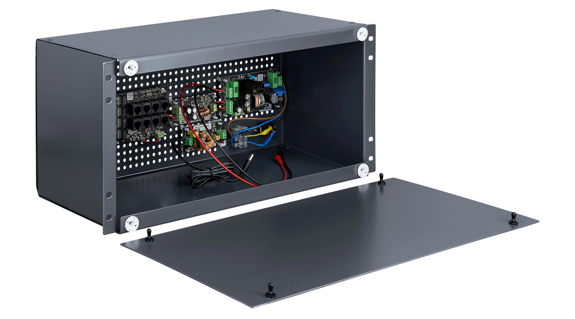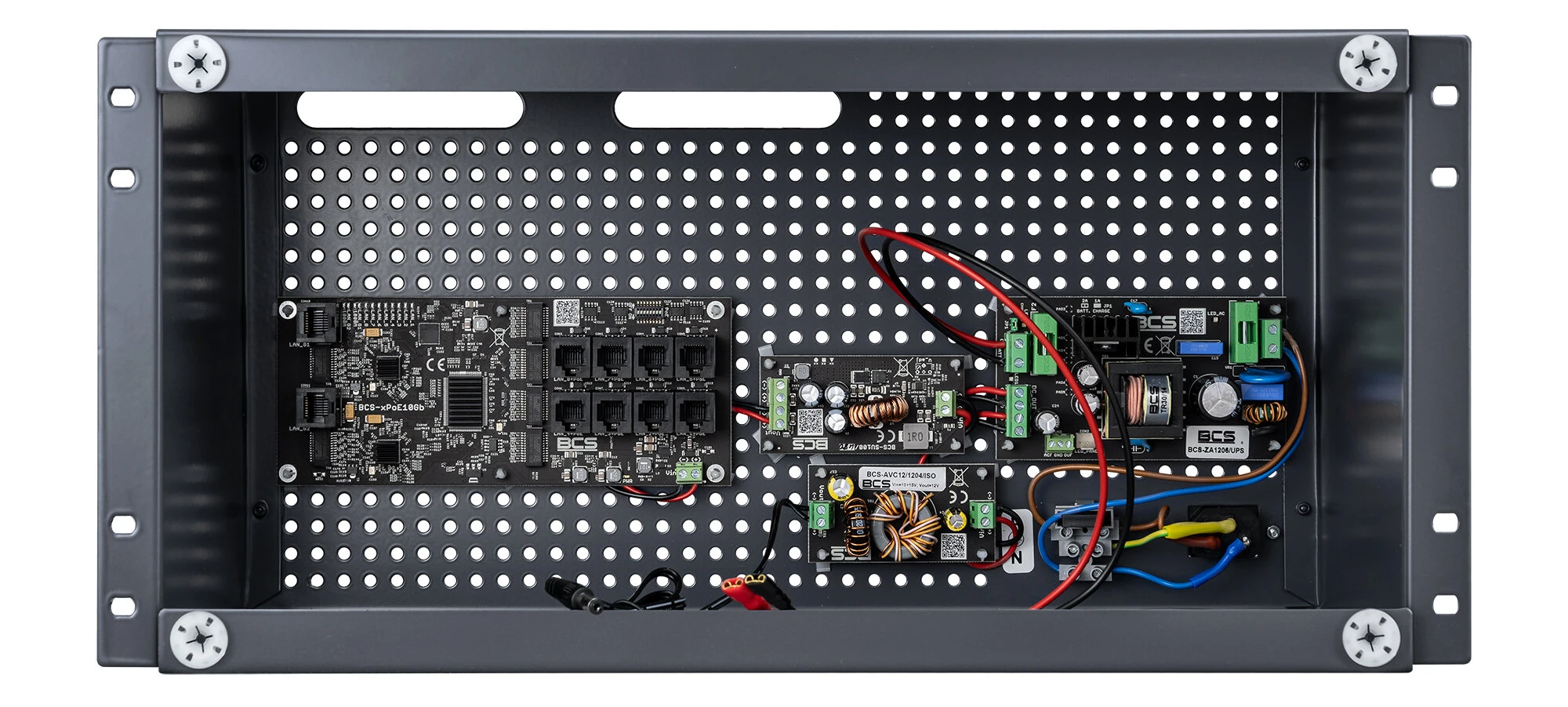 BCS-UPS/IP8Gb/E-S/RACK5U is a buffer power supply kit for IP CCTV cameras. The device is a convenient solution to the problem of buffer power supply for surveillance cameras requiring uninterruptible operation. The device is designed to work with IP cameras and other network devices powered by PoE 802.3at/af and PoE PASSIVE standard. In addition, it has 1 free space for an 18Ah battery, allowing your surveillance system to operate during a power failure. The device is especially recommended for systems requiring higher network bandwidth such as 4K Ultra HD CCTV. The device is enclosed in an enclosure that allows it to be built into a teletechnical RACK cabinet. The well-thought-out design, unique on the Polish market, makes it possible to install the devices, along with the buffer power supply and batteries, in a single housing. The body is manufactured from steel sheet, and the masking cover from lightweight aluminum sheet. Both elements are powder-coated in semi-matte, graphite RAL 7024 color.